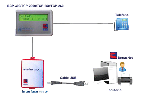 El interfase USB permite la conexión de los tarifadores BONUS con el PC para el uso del software de gestión de las cabinas denominado BONUSNET. Este software es muy completo y permite tener múltiples opciones de control tanto para el usuario como para el dueño del punto de llamadas. Conozca más el software BONUSNET